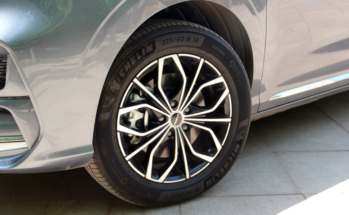 荣威iMAX8 EV尾部加入了“EV”标识,可以一眼识别出其新能源车型身份。横向镀铬饰条贯穿两侧尾灯,拉伸了视线宽度。两条质感不错的纤细灯带,包裹着一道龙鳞样式的光带,点亮后有极强的辨识度。双色花瓣轮毂配备了米其林e聆悦系列轮胎,规格为225/60 R18。