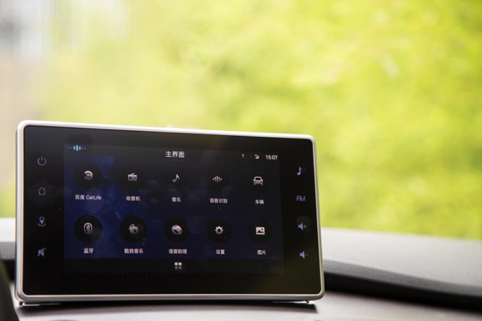 这块8英寸的中控显示屏触感清晰、操作流畅,清晰度也非常的高,功能也十分强大。首先,它具有简介与全部两种显示模式。简洁模式下,我们可以直接从屏幕上进行音乐、导航、空调、收音机的选择使用。通过中央下方的按键便可以调出全部的功能选项,包括常用的车载娱乐、车辆信息、电量信息、车辆设置等功能,非常方便。当然,部分功能驾驶员还可以通过方向盘两侧的多功能按键进行调节。