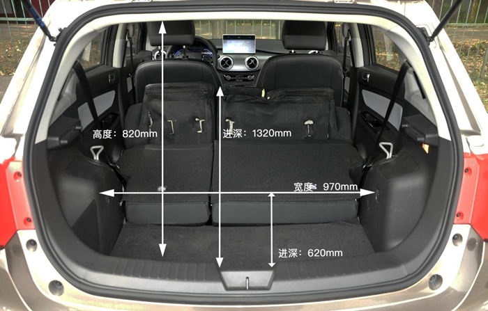EC5的后备箱储物空间也表现出同级别车型当中少有的宽敞,后排座椅支持4/6比例放倒,进深可以达到620-1320mm,后备箱宽度是970mm,高度是820mm,放置不规整的大件行李物品没有任何问题。