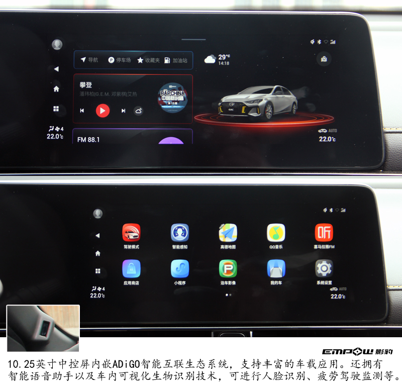 10.25英寸中控屏内嵌ADiGO智能互联生态系统,支持丰富的车载应用。还拥有智能语音助手以及车内可视化生物识别技术,可进行人脸识别、疲劳驾驶监测等等。