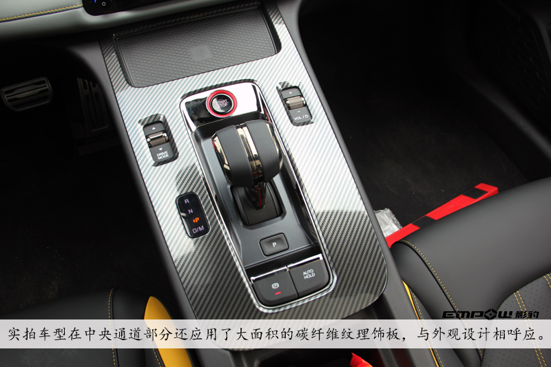 影豹采用环抱式战机座舱,搭配运动式方向盘,同时融入了时下流行的双联屏设计。副仪表台区域延续简约的设计,配备有一键启动及多媒体控制按键。实拍车型在中央通道部分还应用了大面积的碳纤维纹理饰板,与外观设计相呼应。