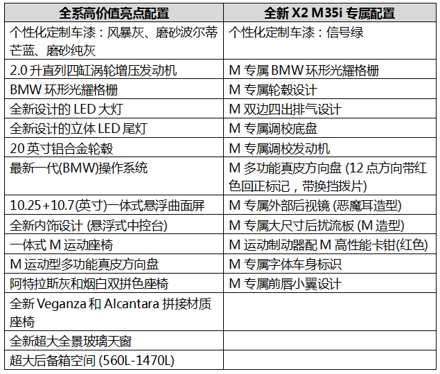 在M动力的加持下,X2 原本就桀骜不驯的基因序列再度进化,释放狂野激情。首次引入X2家族的全新BMW X2 M35i搭载性能卓越的M TwinPower 直列四缸涡轮增压发动机配备运动型7速双离合变速箱,最大输出功率达221千瓦,峰值扭矩达400牛米, 0-100公里/小时加速仅需5.4秒。同时,M专属底盘、M自适应悬架和M专属调校等赋予了全新BMW X2 M35i更优异的操控性和敏捷性,生动诠释酣畅淋漓的热血激情。全新BMW X2 sDrive25i M运动套装与全新BMW X2 xDrive25i M运动曜夜套装搭载2.0升直列四缸涡轮增压发动机,带来150千瓦的最大输出功率和300牛米的峰值扭矩,同样为驾驶者带来不凡的运动性能。